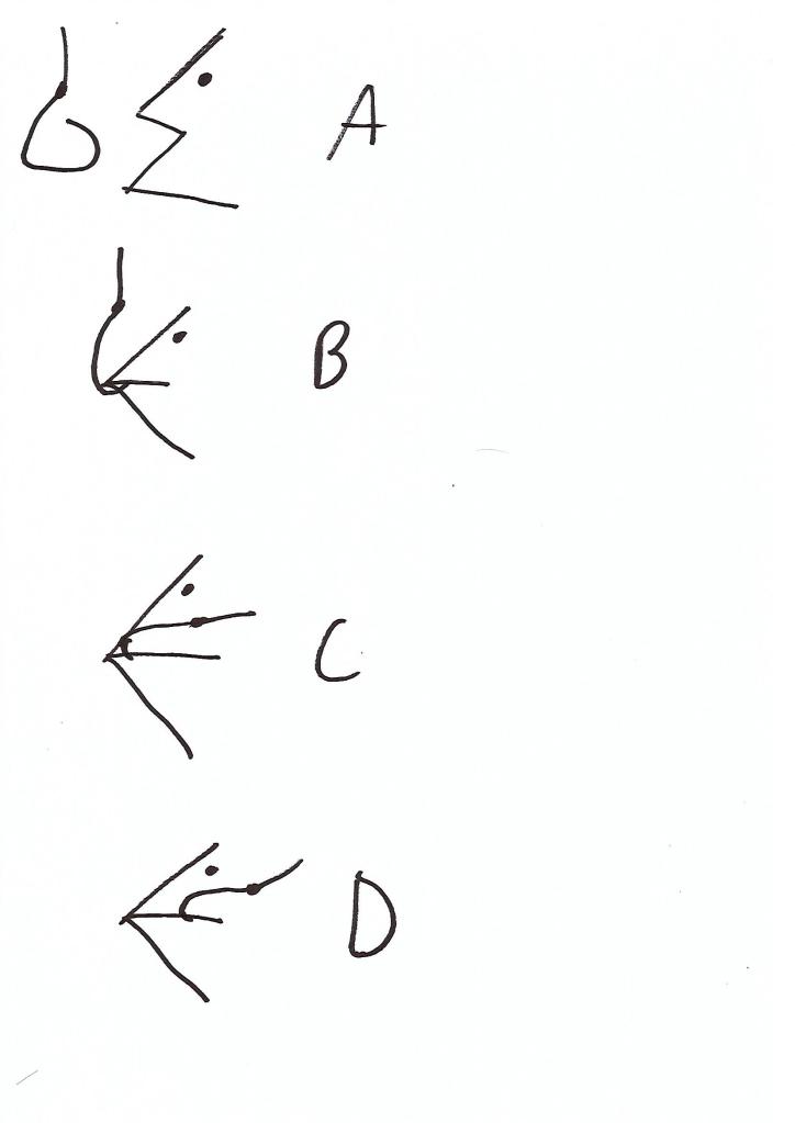 How a circular hook works. A: Fish approaches hook. B: Fish chomps on hook to get at bait. C: Either from the fish swimming away or the fisherman gently tugging, the hook rotates in the mouth. D: Further tension sets the hook so the jaw is caught in the gap. Transcriped from Te Matau a Māui by Chris Paulin and Mark Fenwick